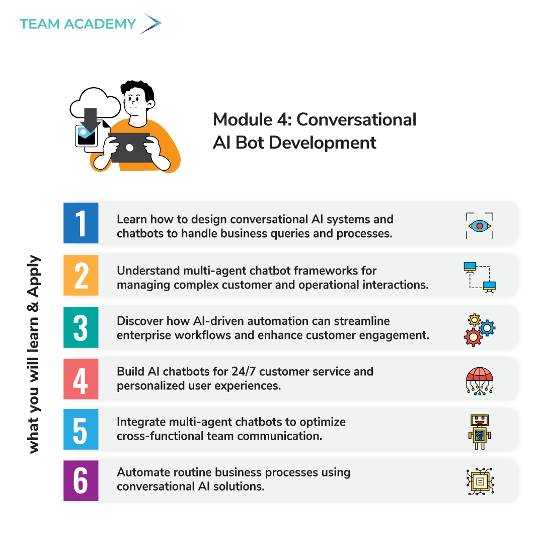 Learn how to design and deploy conversational AI systems for automating processes and enhancing customer interactions. This module covers building multi-agent frameworks and leveraging conversational AI for operational excellence.