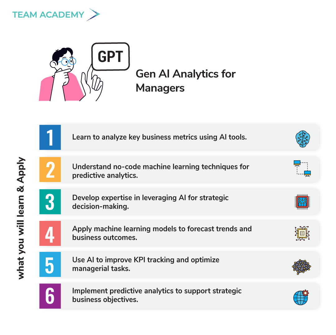 This course offers a deep dive into AI's practical applications, from enhancing business productivity with Large Language Models to automating processes using custom GPTs. Participants will learn how to use AI for data analytics, professional communication, and risk analysis, equipping them with the tools to drive innovation and efficiency in their business operations.