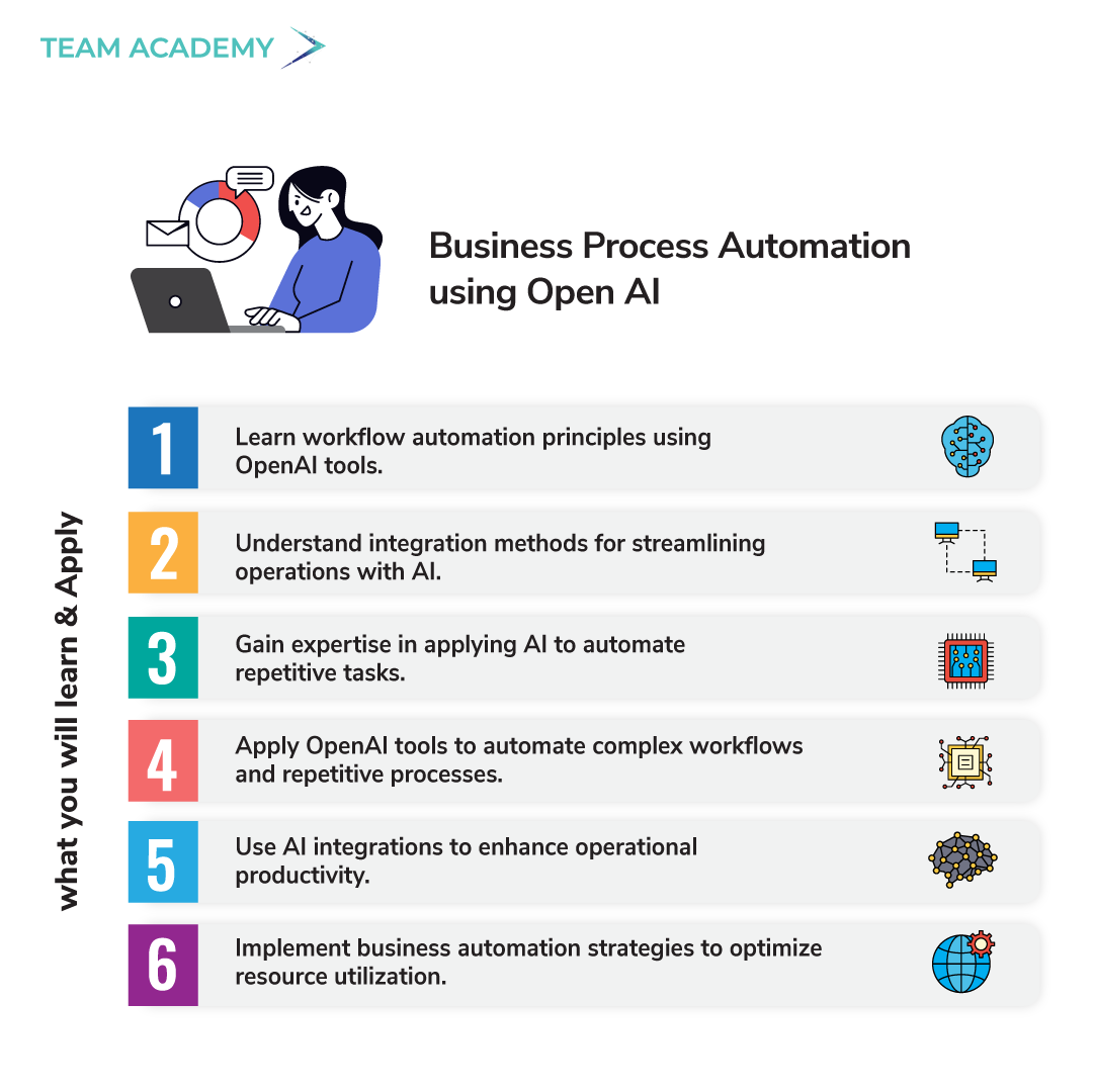 Discover how to automate workflows and repetitive tasks with OpenAI tools to increase productivity and streamline operations. This module highlights real-world applications and integration methods for OpenAI's capabilities.