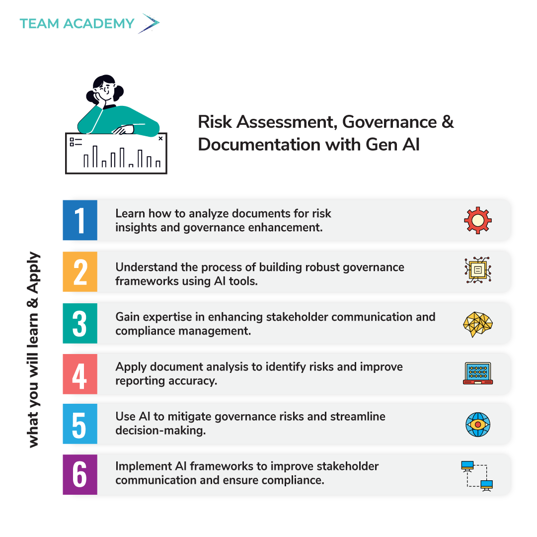 Learn how to analyze documents and assess risks to improve governance and reporting frameworks while enhancing stakeholder communication. This module focuses on using AI tools for smarter decision-making and compliance management.