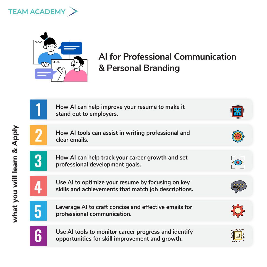 Leverage AI tools to enhance your professional presence through optimized resumes, impactful emails, and strategic branding. This module equips you with the techniques to build a strong personal brand and improve job market positioning.