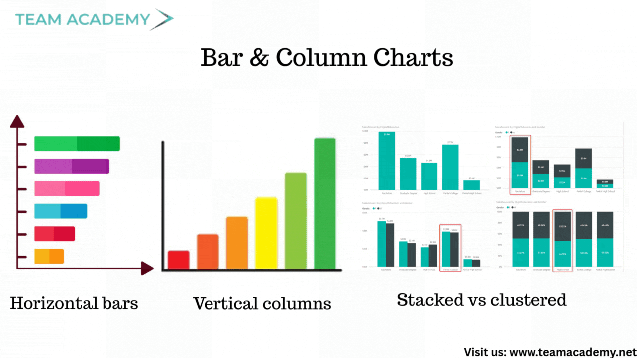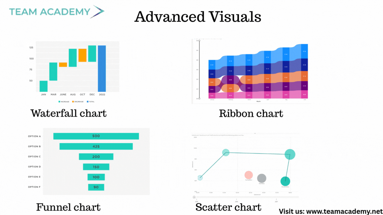 The session provided a deep dive into Power BI chart types and when to use them effectively: