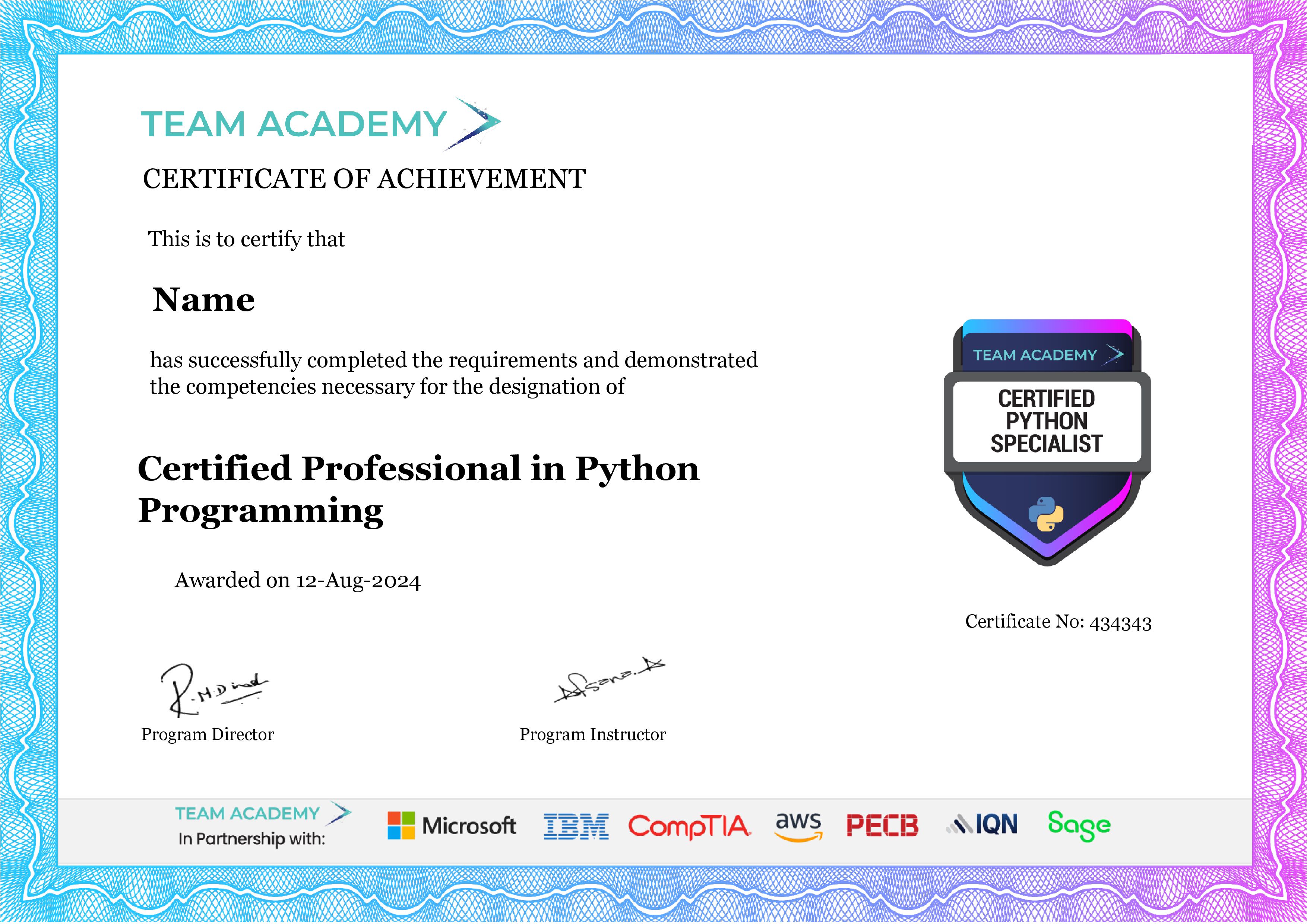 The course prepares participants for a certification exam that tests proficiency in Python programming, covering fundamental to advanced concepts.