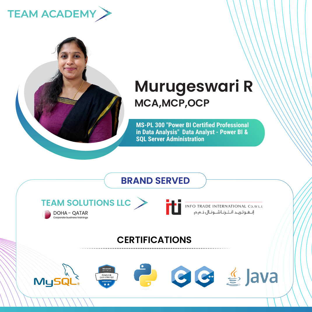 She works on major analytics and data transformation initiatives at Team Solutions LLC in Qatar, supporting organizations such as AAB – Toyota Qatar, Techno Q, MEMBCO, and Al Shaqab Catering.