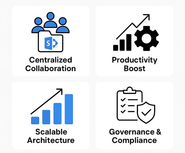 ✅ Requirements & Information Architecture - We begin by understanding your content structure, business processes, permissions model, and user access levels to design a scalable SharePoint architecture.
